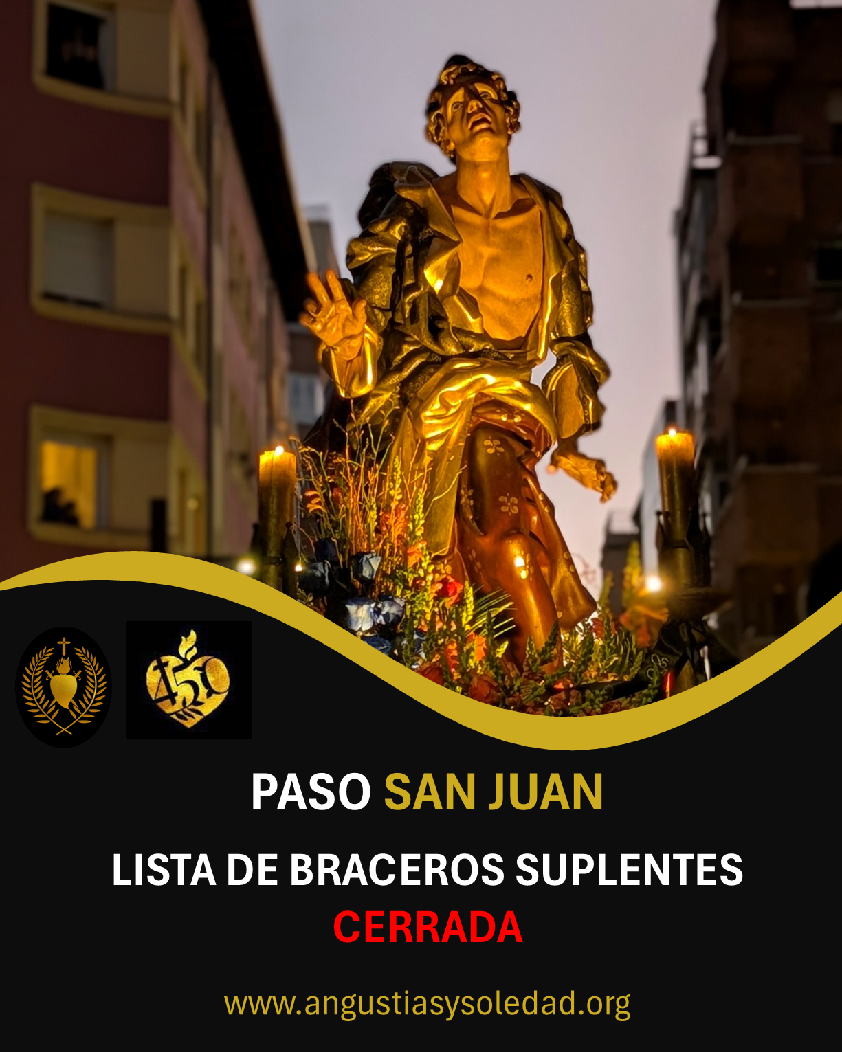 La Cofradía de Nuestra Señora de las Angustias y Soledad informa de que, al haber alcanzado el número de braceros/as suplentes en el paso del...