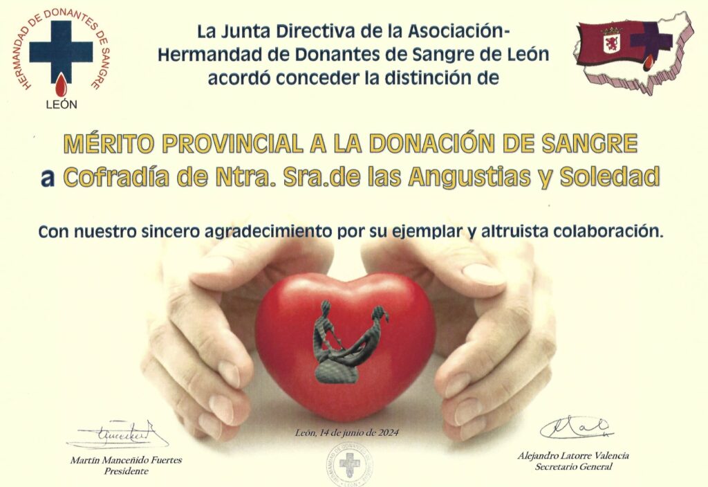 En la mañana de hoy, 14 de junio, Día Mundial de los Donantes de Sangre, la Cofradía ha recibido el galardón al Mérito Provincial de Donantes de Sangre, de manos de su Presidente, D. Martín Manceñido Fuertes.