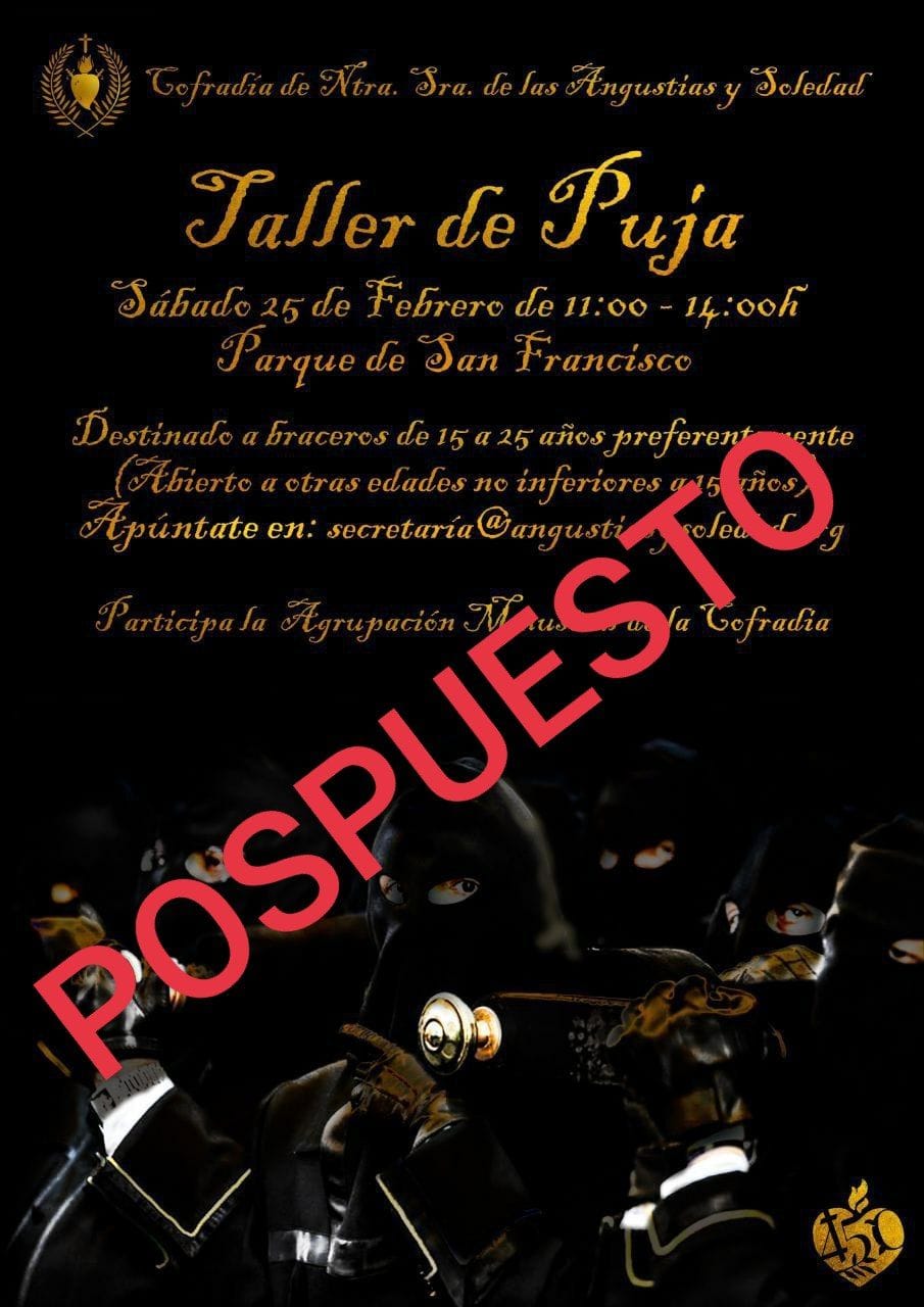 Debido a las previsiones meterológicas, la Junta de Gobierno ha decidido posponer, hasta nuevo aviso, el Taller de Puja programado para el día 25 de febrero. Queridos hermanos: Debido a que las previsiones meteorológicas nos dicen que para el sábado habrá frío y una...