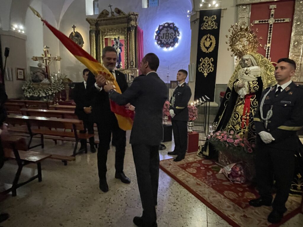 En la tarde de ayer, durante el Solemne Besamanos de Ntra. Sra. de la Soledad, el Coronel Director y hermano de la Cofradía, D. Ignacio de Dompablo Ferrándiz y otros miembros de la Academia Básica del Aire, realizaron la entrega de una Enseña Nacional, como muestra del vínculo que les une con nuestra Cofradía, como Escoltas de Honor del Paso de la Virgen de la Soledad, pasando dicha Enseña a engrandecer el ajuar de enseres de la Virgen.