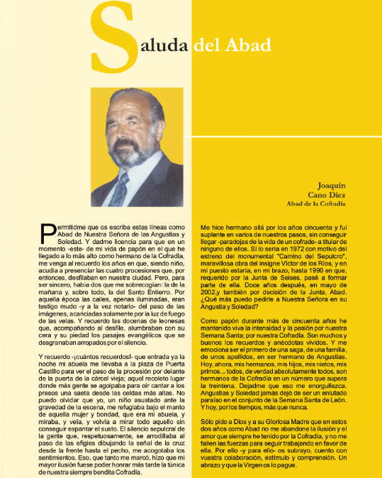 Joaquín fue una figura fundamental en nuestra historia reciente, desempeñando con entrega el cargo de Abad de la Cofradía durante el bienio 2002-2004. Su devoción se forjó bajo el peso de las andas, siendo bracero y seise del paso «Camino del Sepulcro», donde siempre demostró su compromiso y amor por nuestra Cofradía.