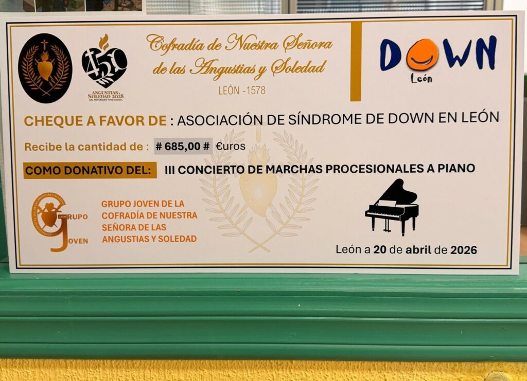 Hoy, con inmensa alegría, nuestra Cofradía ha hecho entrega a Amidown León de la recaudación del III Concierto Solidario de Marchas Procesionales a Piano organizado por Nuestro Grupo Joven.