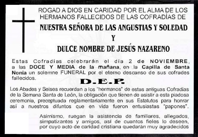 Los Abades y Seises recuerdan a los hermanos de estas antiguas Cofradías de la Semana Santa de León, la obligación que tienen de asistir a esta piadosa ceremonia, preceptuada reglamentariamente en sus estatutos para honrar así a nuestros difuntos que en vida fueron entusiastas «papones».