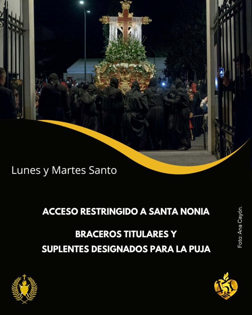 Por la seguridad de todos los hermanos y personas implicadas en sacar la Procesión, sólo podrán acceder al interior de la Capilla de Santa Nonia los braceros titulares y suplentes designados para el inicio de la procesión.