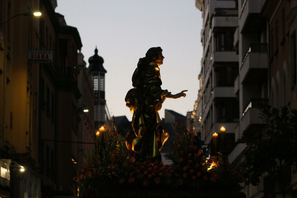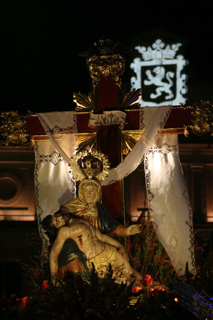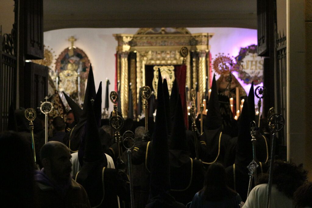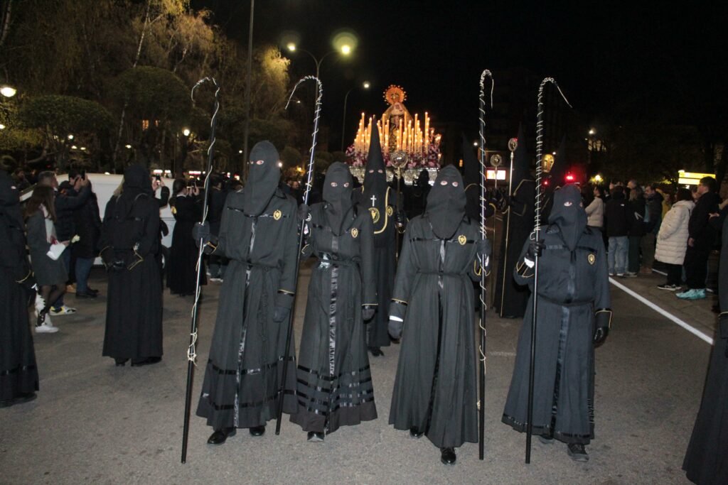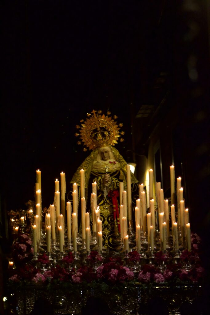 Como cada Martes Santo, el desfile procesional cobró un profundo calado emocional al brindarnos la oportunidad de acompañar en un mismo cortejo a tres de las cinco imágenes marianas que atesora nuestra penitencial, conformando una estampa de incalculable valor en la que pudimos arropar por igual a la Virgen de las Lágrimas y a nuestras titulares, la Virgen de las Angustias y Nuestra Señora de la Soledad, evidenciando el inmenso amor que la Cofradía le profesa a la Madre en sus distintos dolores. El recorrido estuvo guiado en su inicio por la talla de San Juan, el discípulo amado, a la que siguieron los tres pasos marianos impulsados por el esfuerzo de sus braceros y braceras bajo las andas, quienes marcaron el pulso vivo de la tarde al compás de las secciones musicales que pusieron voz a nuestro caminar y envolvieron cada avance de la procesión.