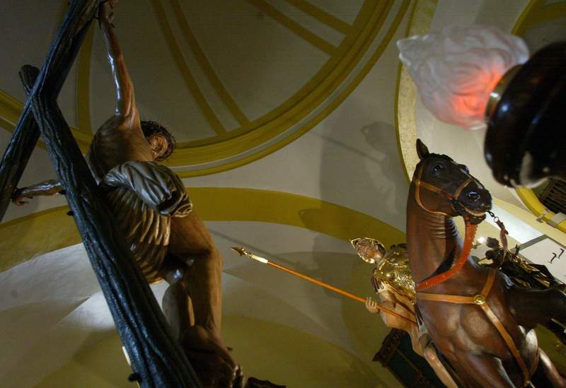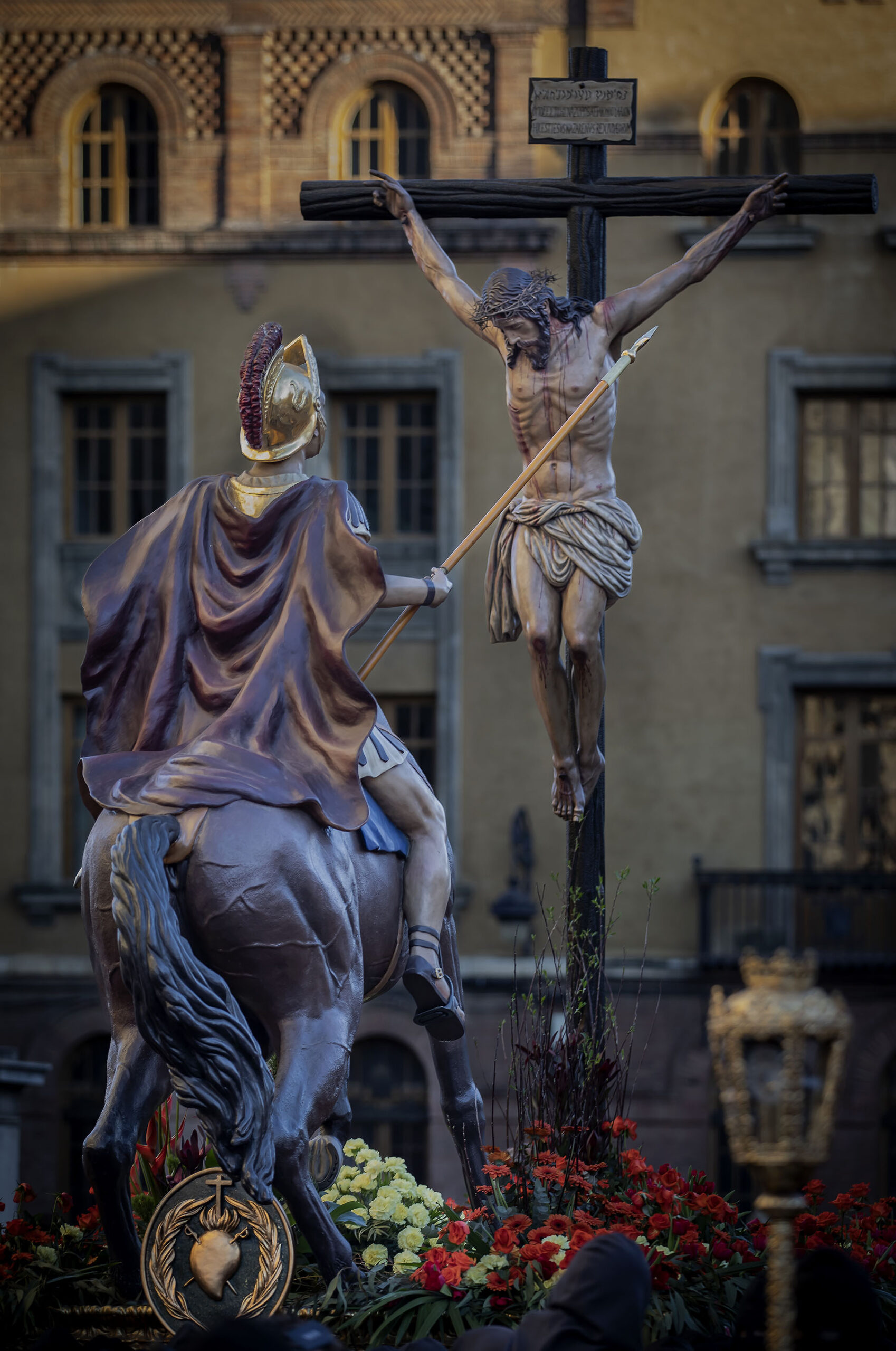 El conjunto de Longinos, su áuriga y el caballo, es deudor de los monumentos ecuestres barrocos, proporcionando un sugestivo juego de tensiones contrapuestas en la descripción del animal y la valiente y osada actitud del emocionado jinete que trata de dominar el movimiento de un erguido y encabritado caballo que le opone resistencia, observese también la sensación que da la capa de estar flotando en el aire. El caballo se espanta ante Dios muerto, el convertido romano Longinos, así lo expresa su mirada, se pasma ante lo que por su mano ha acaecido.