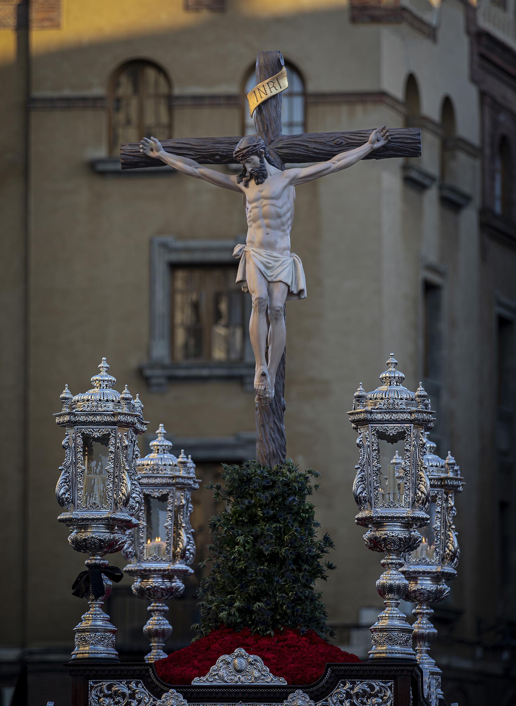 La talla del Santo Cristo es de autor y época desconocidas, aunque tradicionalmente se ha venido atribuyendo a la escuela vallisoletana del siglo XVI, parece ser que remataba el retablo que la Cofradía tenía en el desaparecido Convento de Santo Domingo el Real . Es una escultura de bulto redondo de un tamaño ligeramente menor al natural, se trata de una talla con un claro afán naturalista en la que se pone el acento en el estudio anatómico con un gusto por el detalle que se materializa en una representación marcada de cada uno de los músculos y tendones de la anatomía, en especial en el potente torso. Es una imagen armónica y proporcionada que se adapta a un canon estilizado, fue restaurado en 1947 por Víctor de los Ríos, y en aquella época salía en procesión con el trono que actualmente es catafalco sobre el que procesiona el Cristo Yacente, obra también del mismo autor.