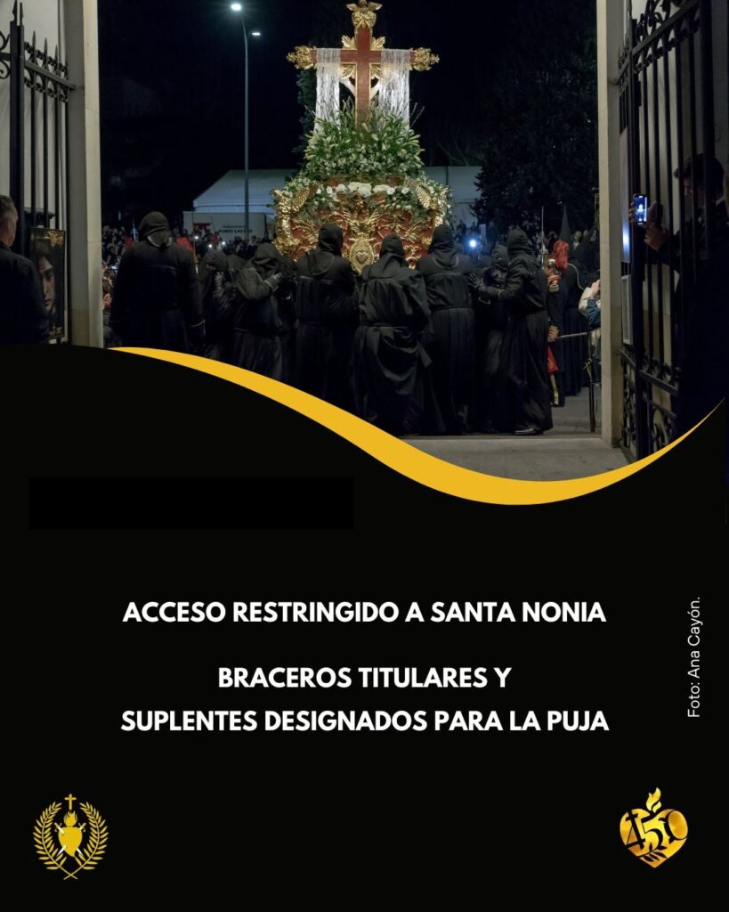 Por la seguridad de todos los hermanos hermanas y de las personas implicadas en sacar la Procesión, sólo podrán acceder al interior de la Capilla de Santa Nonia los braceros titulares y suplentes designados para el inicio de la procesión.