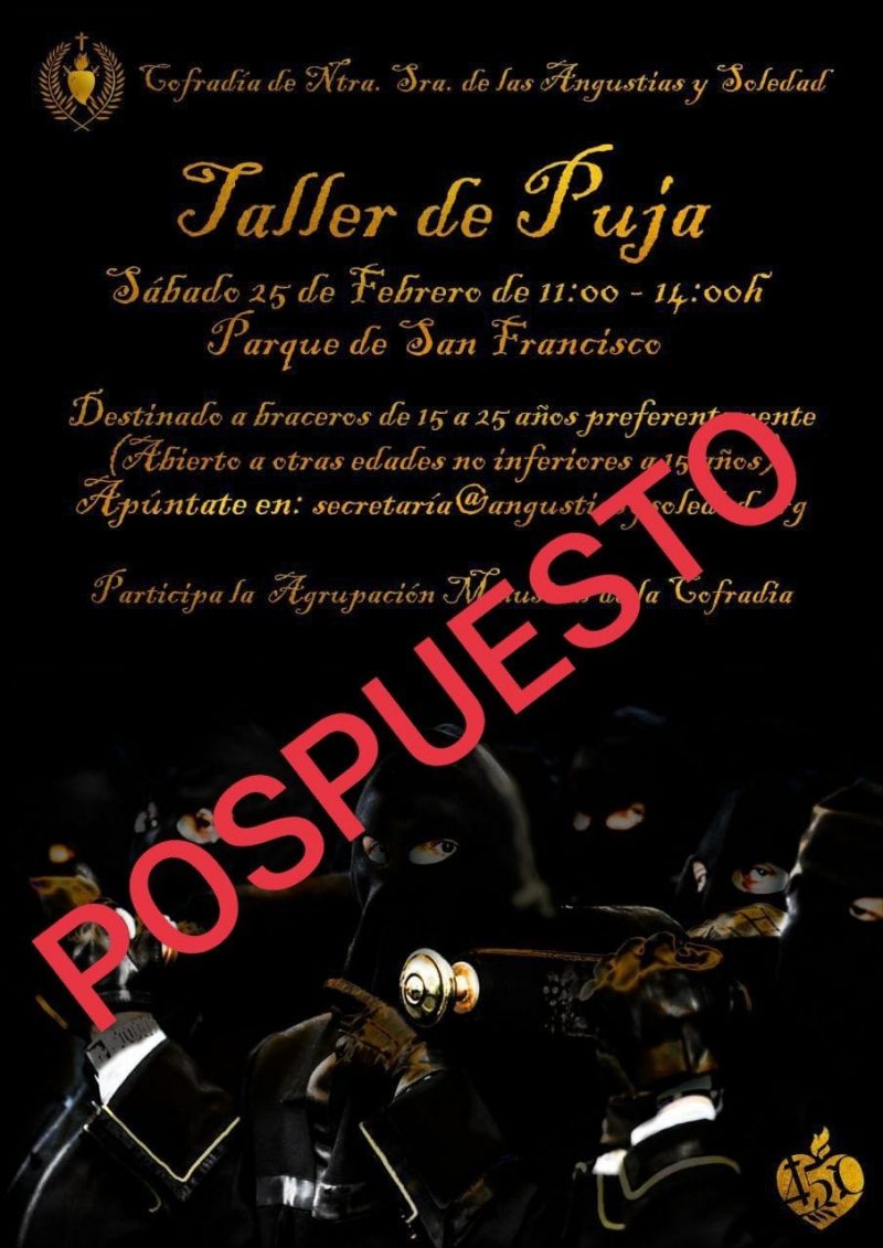 Debido a las previsiones meterológicas, la Junta de Gobierno ha decidido posponer, hasta nuevo aviso, el Taller de Puja programado para el día 25 de febrero.