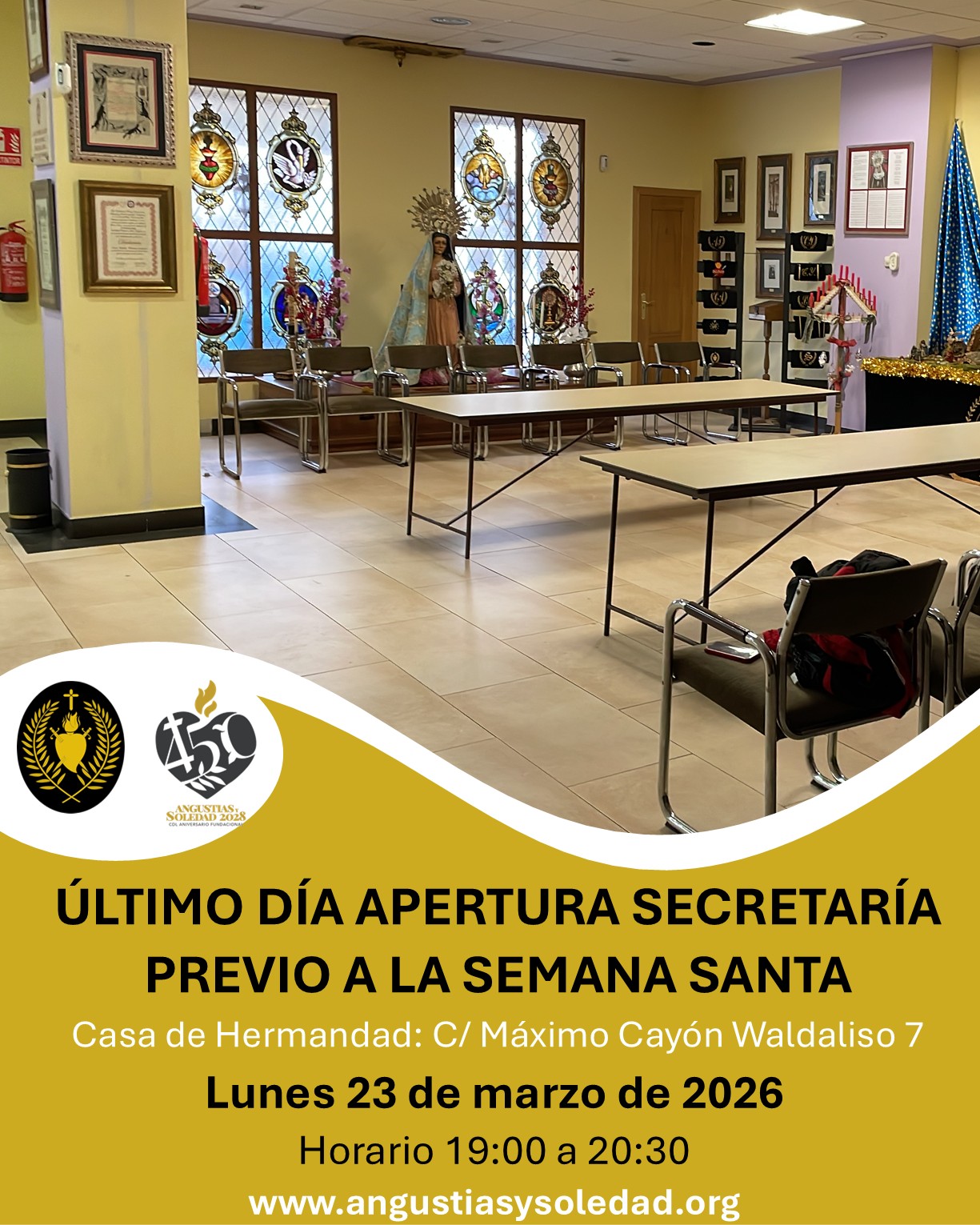 Se informa a los hermanos y hermanas de que el último día de apertura de la secretaría de la Cofradía previo a la Semana Santa será el próximo lunes 23 de marzo. Una vez pasada la misma, la Secreataría recuperará su horario habitual.